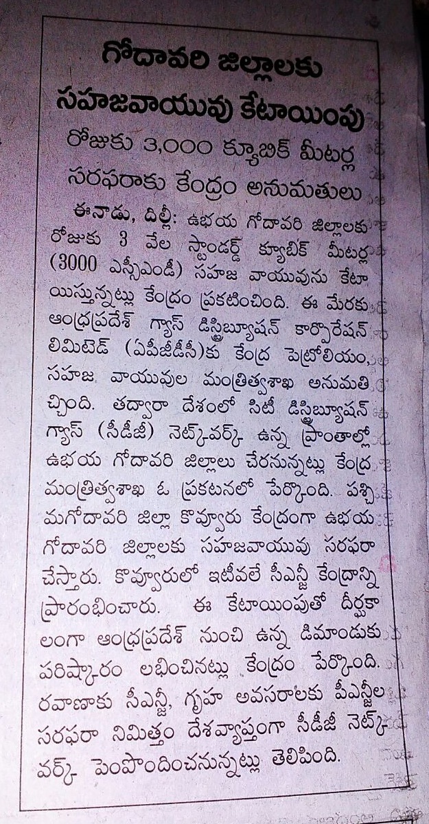 గోదావరి జిల్లాల్లో సహజ వాయువు కేటాయింపు